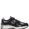 The New Balance 2002R feature a brownish-grey fabric, with blue mesh underneath. This sleek model is crafted from calf suede and sits atop a cushioned and supportive sole.